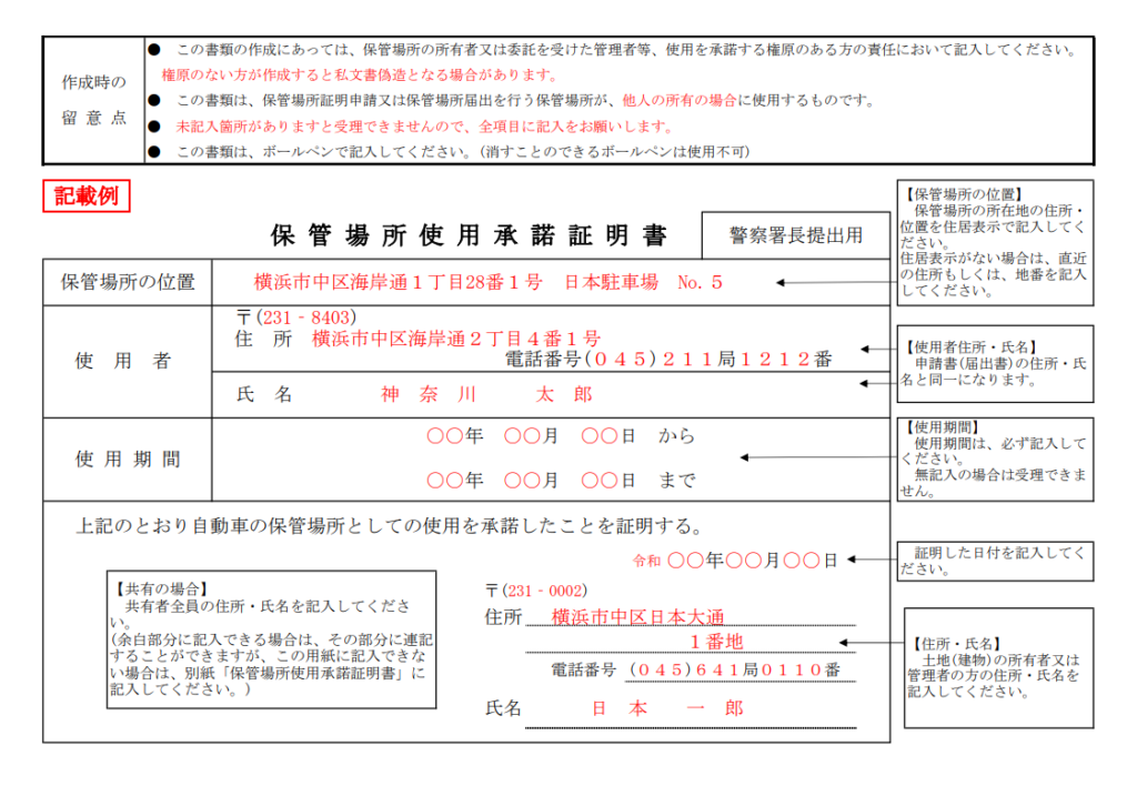 使用承諾証明書とは、自己所有でない、他人所有の土地建物を保管場所として使う場合に必要になる書類です。例えば、月極駐車場や共有地を保管場所として使用する場合に必要な書類になります。